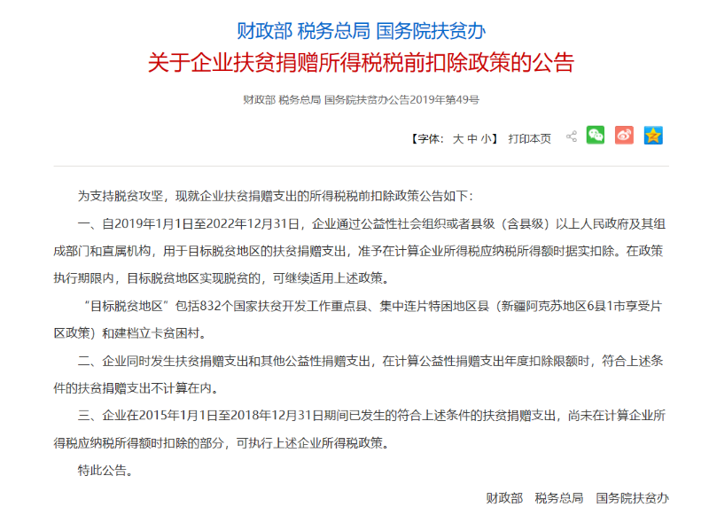 关于企业扶贫捐赠所得税税前扣除政策的公告-2019年第49号