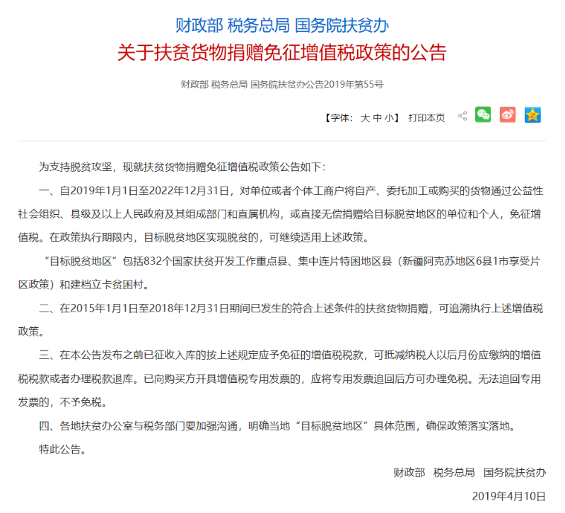 关于扶贫货物捐赠免征增值税政策的公告-2019年第55号